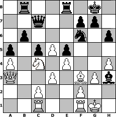 game notation in PGN-format [Event "2. Chess960/1"] [Site "www.myChess.de"] [Date "2008.03.15"] [Round "1"] [White "Stabiloboss"] [Black "Briegel@"] [Variant "Fischerrandom"] [SetUp "1"] [FEN "rqnbbknr/pppppppp/8/8/8/8/PPPPPPPP/RQNBBKNR w KQkq - 0 1"] [WhitemyELO "1524"] [BlackmyELO "1500"] [Result "1/2-1/2"] [TimeControl "10/3456000"] [WhiteDays "19"] [BlackDays "28"] [MyChessNo "43403"] 1. c4 c5 2. e4 d6 3. d3 e5 4. Nf3 Nf6 5. O-O O-O 6. Ne2 Ne7 7. Bd2 Nc6 8. a3 Bd7 9. b4 h6 10. h3 Bb6 11. Qb2 Qc7 12. Nc3 Rfe8 13. Nd5 Nxd5 14. cxd5 Ne7 15. Rc1 Ng6 16. Be3 Rac8 17. a4 a5 18. bxc5 Bxc5 19. Bxc5 dxc5 20. h4 Nf4 21. Qa3 b6 22. g3 Nh5 23. Nd2 Nf6 24. Nc4 Rb8 25. Bf3 Bh3 1/2-1/2 position notation in FEN-format 1r2r1k1/2q2pp1/1p3n1p/p1pPp3/P1N1P2P/Q2P1BPb/2P2P2/2R2RK1 - - - 7 26 Captured white pieces: Captured black pieces: Click on a captured piece in order to display the desired move!