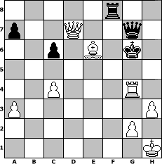 game notation in PGN-format [Event "wie w"] [Site "www.myChess.de"] [Date "2013.11.16"] [Round "1"] [White "Winston"] [Black "borsti"] [ECO "C41"] [WhitemyELO "1550"] [BlackmyELO "1203"] [Result "1-0"] [TimeControl "10/1728000"] [WhiteDays "20"] [BlackDays "20"] [MyChessNo "91130"] 1. e4 e5 2. Nf3 d6 3. h3 Nf6 4. Nc3 Be6 5. Be2 d5 6. exd5 Bxd5 7. d3 Bxf3 8. Bxf3 c6 9. Be3 Bb4 10. Bd2 Bxc3 11. Bxc3 Nbd7 12. O-O O-O 13. a3 Re8 14. Bd2 Nc5 15. b4 Ne6 16. c3 h6 17. Qc1 Nh7 18. Bxh6 gxh6 19. Qxh6 f5 20. Qg6+ Kh8 21. Qxf5 Qf6 22. Qe4 Nhg5 23. Qh4+ Kg7 24. Qg3 Rad8 25. Be4 Rh8 26. Ra2 Kf7 27. f3 Ke7 28. d4 exd4 29. c4 Rhf8 30. Raf2 Qg7 31. b5 Rc8 32. bxc6 bxc6 33. Kh1 Rg8 34. Bf5 Rcf8 35. Bg4 d3 36. f4 Ne4 37. Qxd3 Nxf2+ 38. Rxf2 Rxf4 39. Bxe6 Rgf8 40. Qd7+ Kf6 41. Rxf4+ Kg6 42. Rg4+ 1-0 position notation in FEN-format 5r2/p2Q2q1/2p1B1k1/8/2P3R1/P6P/6P1/7K - - - 2 42 Captured white pieces: Captured black pieces: Click on a captured piece in order to display the desired move!