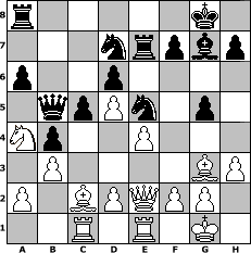 game notation in PGN-format [Event "Modernes Benoni"] [Site "www.myChess.de"] [Date "2010.01.14"] [Round "2"] [White "reymund"] [Black "schoemi"] [ECO "A61"] [WhitemyELO "1649"] [BlackmyELO "1546"] [Result "0-1"] [TimeControl "10/2592000"] [WhiteDays "37"] [BlackDays "51"] [MyChessNo "62403"] 1. d4 Nf6 2. c4 c5 3. d5 e6 4. Nc3 exd5 5. cxd5 d6 6. Nf3 g6 7. e4 Bg7 8. Bd3 O-O 9. O-O Re8 10. Re1 Bg4 11. h3 Bxf3 12. Qxf3 Nbd7 13. Bc2 Qa5 14. Bf4 Ne5 15. Qe2 Nfd7 16. Ba4 Re7 17. Rac1 a6 18. Bg3 b5 19. Bc2 b4 20. Na4 Qb5 21. b3 g5 0-1 position notation in FEN-format r5k1/3nrpbp/p2p4/1qpPn1p1/Np2P3/1P4BP/P1BPQPP1/2R1R1K1 - - - 0 22 Captured white pieces: Captured black pieces: Click on a captured piece in order to display the desired move!