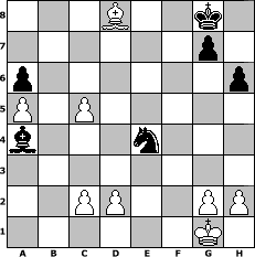 game notation in PGN-format [Event "Kleines Herbstturnier"] [Site "www.myChess.de"] [Date "2004.10.28"] [Round "1"] [White "Knight"] [Black "Falcor"] [ECO "D00"] [WhitemyELO "1132"] [BlackmyELO "1222"] [Result "0-1"] [TimeControl "10/2592000"] [WhiteDays "120"] [BlackDays "104"] [MyChessNo "7643"] 1. d4 d5 2. e4 dxe4 3. Nc3 Nf6 4. f3 Nc6 5. Bb5 Qd6 6. d5 a6 7. Bxc6+ bxc6 8. fxe4 cxd5 9. exd5 Qe5+ 10. Nge2 Bb7 11. Bf4 Qf5 12. O-O Qg6 13. Bxc7 e6 14. Nf4 Qg5 15. Qe2 Be7 16. d6 Qc5+ 17. Kh1 Bxd6 18. Nxe6 fxe6 19. Qxe6+ Be7 20. Bb6 Qc6 21. Qxc6+ Bxc6 22. Rae1 Kf7 23. a4 Rab8 24. a5 Bb4 25. Re3 Rhe8 26. Rd3 Kg8 27. Rd1 Bxc3 28. bxc3 Ne4 29. Bd4 Rb5 30. Bb6 Rf8 31. c4 Rbf5 32. Kg1 Ba4 33. Rd8 h6 34. Rxf8+ Rxf8 35. c5 Nc3 36. Rd6 Rc8 37. Rd8+ Rxd8 38. Bxd8 Ne4 0-1 position notation in FEN-format 3B2k1/6p1/p6p/P1P5/b3n3/8/2PP2PP/6K1 - - - 1 39 Captured white pieces: Captured black pieces: Click on a captured piece in order to display the desired move!