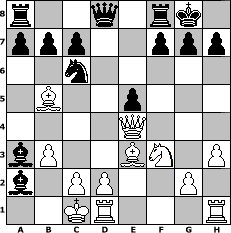 game notation in PGN-format [Event "R"] [Site "www.myChess.de"] [Date "2010.08.26"] [Round "1"] [White "Knight"] [Black "werderfan"] [ECO "D00"] [WhitemyELO "1176"] [BlackmyELO "1533"] [Result "0-1"] [TimeControl "10/864000"] [WhiteDays "19"] [BlackDays "19"] [MyChessNo "67873"] 1. d4 d5 2. e4 dxe4 3. Nc3 Nf6 4. f3 exf3 5. Qxf3 Qxd4 6. Be3 Qd8 7. Bd3 Nc6 8. h3 e5 9. O-O-O Bd6 10. Bb5 Bd7 11. Nd5 Nxd5 12. Qxd5 O-O 13. Nf3 Be6 14. Qe4 Bxa2 15. b3 Ba3# 0-1 position notation in FEN-format r2q1rk1/ppp2ppp/2n5/1B2p3/4Q3/bP2BN1P/b1PP2P1/2KR3R - - - 1 16 Captured white pieces: Captured black pieces: Click on a captured piece in order to display the desired move!