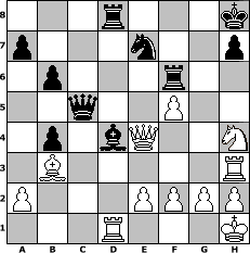 game notation in PGN-format [Event "mySchach Herbst-Open 2009"] [Site "www.myChess.de"] [Date "2009.09.25"] [Round "1"] [White "Nowak"] [Black "deepsabel"] [ECO "C63"] [WhitemyELO "1866"] [BlackmyELO "1972"] [Result "1-0"] [TimeControl "10/2592000"] [WhiteDays "30"] [BlackDays "30"] [MyChessNo "59266"] 1. e4 e5 2. Nf3 Nc6 3. Bb5 f5 4. d3 fxe4 5. dxe4 Nf6 6. O-O Bc5 7. Nc3 d6 8. Bg5 O-O 9. Nd5 Kh8 10. Bc4 Be6 11. c3 Ne7 12. Bxf6 gxf6 13. b4 c6 14. Ne3 Bxe3 15. Bxe6 Bb6 16. Nh4 d5 17. Qg4 Qc7 18. Rad1 Rad8 19. c4 dxc4 20. Bxc4 Bd4 21. Rb1 c5 22. Rb3 f5 23. exf5 cxb4 24. Rg3 e4 25. Be6 Qe5 26. Rh3 Rf6 27. Bb3 Qd6 28. Qxe4 b6 29. Rd1 Qc5 30. Kh1 1-0 position notation in FEN-format 3r3k/p3n2p/1p3r2/2q2P2/1p1bQ2N/1B5R/P3PPPP/3R3K - - - 3 30 Captured white pieces: Captured black pieces: Click on a captured piece in order to display the desired move!