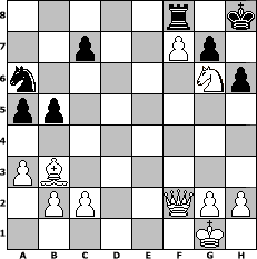 game notation in PGN-format [Event "STHLM"] [Site "www.myChess.de"] [Date "2010.03.25"] [Round "2"] [White "lasker"] [Black "Haneken"] [ECO "A13"] [WhitemyELO "1408"] [BlackmyELO "1443"] [Result "1-0"] [TimeControl "10/1728000"] [WhiteDays "25"] [BlackDays "17"] [MyChessNo "64320"] 1. c4 e6 2. d4 d5 3. Nc3 dxc4 4. e4 a6 5. Bxc4 b5 6. Bb3 Bb7 7. a3 Nf6 8. Bg5 h6 9. Bxf6 Qxf6 10. Nf3 Qg6 11. O-O Bxe4 12. Nxe4 Qxe4 13. Re1 Qc6 14. Rc1 Qb6 15. d5 Bc5 16. Qd2 O-O 17. dxe6 Kh8 18. exf7 a5 19. Re8 Nc6 20. Rce1 Rd8 21. Rxf8+ Rxf8 22. Re8 Bxf2+ 23. Qxf2 Qb8 24. Rxb8 Nxb8 25. Ne5 Na6 26. Ng6+ 1-0 position notation in FEN-format 5r1k/2p2Pp1/n5Np/pp6/8/PB6/1PP2QPP/6K1 - - - 3 26 Captured white pieces: Captured black pieces: Click on a captured piece in order to display the desired move!