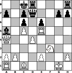 game notation in PGN-format [Event "9er5"] [Site "www.myChess.de"] [Date "2015.01.04"] [Round "1"] [White "sprinterde"] [Black "Mattheus"] [ECO "C00"] [WhitemyELO "1667"] [BlackmyELO "1255"] [Result "1-0"] [TimeControl "10/3456000"] [WhiteDays "40"] [BlackDays "40"] [MyChessNo "97419"] 1. e4 e6 2. f4 d5 3. exd5 exd5 4. Nf3 Nc6 5. Bb5 Nf6 6. O-O Bc5+ 7. d4 Bb6 8. Re1+ Ne4 9. Nc3 Bf5 10. Nxe4 dxe4 11. Bxc6+ bxc6 12. g4 Bxg4 13. Rxe4+ Be6 14. f5 Qd5 15. Re5 Qd7 16. fxe6 fxe6 17. c4 O-O-O 18. c5 Ba5 19. Qa4 1-0 position notation in FEN-format 2kr3r/p1pq2pp/2p1p3/b1P1R3/Q2P4/5N2/PP2P2P/R1B3K1 - - - 2 19 Captured white pieces: Captured black pieces: Click on a captured piece in order to display the desired move!