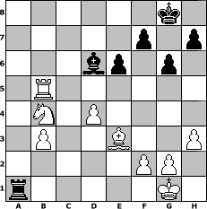game notation in PGN-format [Event "1.Chess in Friendship"] [Site "www.myChess.de"] [Date "2004.08.10"] [Round "1"] [White "Wormatia08"] [Black "OwainGwynedd"] [ECO "C01"] [WhitemyELO "1583"] [BlackmyELO "1263"] [Result "0-1"] [TimeControl "10/2592000"] [WhiteDays "098"] [BlackDays "117"] [MyChessNo "6060"] 1. e4 e6 2. d4 c6 3. c4 d6 4. Nc3 g6 5. Nf3 Bg7 6. Be2 a5 7. O-O Ne7 8. Be3 d5 9. cxd5 cxd5 10. Bb5+ Nd7 11. Rc1 Qb6 12. b3 O-O 13. exd5 Nxd5 14. Bxd7 Bxd7 15. Nxd5 Qd6 16. Nf4 Bf6 17. Ne5 Bb5 18. Re1 Be7 19. Nc4 Qc6 20. Na3 Qd7 21. Nxb5 Qxb5 22. Rc7 Bd6 23. Rc2 Rad8 24. Qf3 Rd7 25. Rec1 Rdd8 26. Qe2 Qd7 27. Qf3 Ba3 28. Rc7 Qd6 29. R1c2 b5 30. Qc6 Rfe8 31. Qxd6 Bxd6 32. Rb7 b4 33. h3 Rc8 34. Rxc8 Rxc8 35. Rb5 Ra8 36. Nd3 a4 37. Nxb4 axb3 38. axb3 Ra1+ 0-1 position notation in FEN-format 6k1/5p1p/3bp1p1/1R6/1N1P4/1P2B2P/5PP1/r5K1 - - - 1 39 Captured white pieces: Captured black pieces: Click on a captured piece in order to display the desired move!