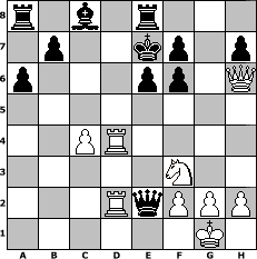 game notation in PGN-format [Event "\" Gehirn Jogging A 2 \""] [Site "www.myChess.de"] [Date "2011.12.23"] [Round "1"] [White "BobbyF4"] [Black "beowulf"] [ECO "B20"] [WhitemyELO "1463"] [BlackmyELO "1395"] [Result "1-0"] [TimeControl "10/1728000"] [WhiteDays "20"] [BlackDays "20"] [MyChessNo "78526"] 1. e4 c5 2. d4 cxd4 3. Bc4 Nc6 4. c3 dxc3 5. Nxc3 e6 6. Nf3 Nf6 7. Qe2 Bb4 8. O-O O-O 9. Rd1 Bxc3 10. bxc3 d5 11. exd5 Nxd5 12. Bb2 Nce7 13. Rab1 a6 14. Qe4 Qa5 15. Bxd5 Nxd5 16. c4 Nf6 17. Bxf6 gxf6 18. Rb3 Re8 19. Qh4 Qf5 20. Rd4 Qc2 21. Rg4+ Kf8 22. Qh6+ Ke7 23. Rd4 Qxa2 24. Rbd3 Qe2 25. Rd2 1-0 position notation in FEN-format r1b1r3/1p2kp1p/p3pp1Q/8/2PR4/5N2/3RqPPP/6K1 - - - 3 25 Captured white pieces: Captured black pieces: Click on a captured piece in order to display the desired move!