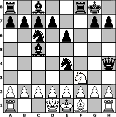 | game notation in PGN-format [Event "Mail"] [Site "www.myChess.de"] [Date "2012.05.01"] [Round "1"] [White "Knight"] [Black "BobbyF4"] [ECO "A40"] [WhitemyELO "1218"] [BlackmyELO "1482"] [Result "0-1"] [TimeControl "10/864000"] [WhiteDays "10"] [BlackDays "08"] [MyChessNo "81392"] 1. d4 e5 2. dxe5 Nc6 3. e6 fxe6 4. Nf3 Bc5 5. Nc3 Nf6 6. Bg5 O-O 7. Ne4 Nxe4 8. Bh4 Qxh4 0-1 position notation in FEN-format r1b2rk1/pppp2pp/2n1p3/2b5/4n2q/5N2/PPPPPPPP/R2QKB1R - KQ - 0 9 Captured white pieces:                              Captured black pieces:                               Click on a captured piece in order to display the desired move!