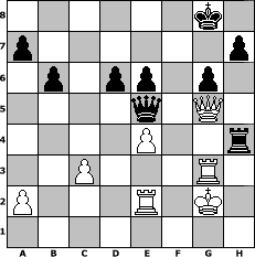 game notation in PGN-format [Event "Weihnachtstunier"] [Site "www.myChess.de"] [Date "2005.12.14"] [Round "1"] [White "Bolligru"] [Black "BirdofPray1"] [ECO "A40"] [WhitemyELO "1875"] [BlackmyELO "2032"] [Result "1-0"] [TimeControl "10/864000"] [WhiteDays "10"] [BlackDays "10"] [MyChessNo "20769"] 1. d4 g6 2. Nf3 Bg7 3. c4 Nh6 4. e4 O-O 5. Nc3 c5 6. h4 cxd4 7. Nxd4 Nc6 8. Nb3 d6 9. h5 Bxc3+ 10. bxc3 Ng4 11. Be2 Nf6 12. Bh6 Re8 13. hxg6 fxg6 14. f3 Be6 15. Qd2 b6 16. g4 Rc8 17. g5 Nh5 18. Rg1 Ne5 19. f4 Nxf4 20. Qxf4 Bxc4 21. Bxc4+ Rxc4 22. Rg3 Qc8 23. Qe3 Qc6 24. Nd2 Rc5 25. Qd4 Rc8 26. Rc1 Ra5 27. Rc2 e6 28. Qf2 Qe8 29. Kf1 Rc7 30. Kg1 Rf7 31. Qe2 Rc5 32. Nf3 Qc6 33. Nxe5 Rxe5 34. Re3 Qc5 35. Kg2 Rf4 36. Rf3 Rxg5+ 37. Bxg5 Qxg5+ 38. Rg3 Qc5 39. Qe3 Qe5 40. Re2 Rh4 41. Qg5 1-0 position notation in FEN-format 6k1/p6p/1p1pp1p1/4q1Q1/4P2r/2P3R1/P3R1K1/8 - - - 7 41 Captured white pieces: Captured black pieces: Click on a captured piece in order to display the desired move!