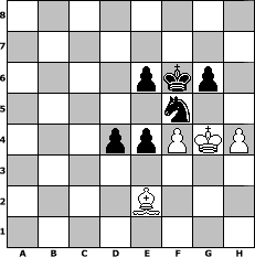 game notation in PGN-format [Event "Neujahrsturnier 2007"] [Site "www.myChess.de"] [Date "2007.01.01"] [Round "1"] [White "tschulz"] [Black "Andylein1989"] [ECO "A00"] [WhitemyELO "1617"] [BlackmyELO "1406"] [Result "0-1"] [TimeControl "10/864000"] [WhiteDays "50"] [BlackDays "57"] [MyChessNo "31300"] 1. b4 e5 2. b5 d6 3. Bb2 Bd7 4. e3 Nf6 5. a4 Be7 6. d3 O-O 7. Nf3 c6 8. Nc3 cxb5 9. axb5 h6 10. Be2 Qc7 11. O-O Qb6 12. d4 e4 13. Nd2 d5 14. Qb1 a6 15. Ba3 Bxa3 16. Rxa3 Be6 17. Qb3 Nbd7 18. Rfa1 Nb8 19. bxa6 Qxb3 20. cxb3 bxa6 21. Nb5 a5 22. Nc7 Ra7 23. Nxe6 fxe6 24. Rxa5 Rxa5 25. Rxa5 Nc6 26. Ra6 Nd8 27. b4 Rf7 28. b5 Kh7 29. Ra8 Rd7 30. Nf1 Nf7 31. h4 h5 32. Ra6 Re7 33. b6 Nd6 34. Ra7 Rb7 35. Rxb7 Nxb7 36. Ba6 Nd6 37. b7 Nd7 38. Ng3 Nb8 39. Be2 g6 40. Nf1 Nxb7 41. g4 Kh6 42. Ng3 hxg4 43. Bxg4 Nd8 44. Kh2 Nd7 45. Be2 Nf6 46. Kg2 Nc6 47. Ba6 Nh5 48. Be2 Ng7 49. Kh3 Ne7 50. f3 Nef5 51. f4 Nxe3 52. Bb5 Nc2 53. Ne2 Nf5 54. Bd7 Nfxd4 55. Nxd4 Nxd4 56. Kg4 Kg7 57. Ba4 Kf6 58. Bd1 Nf5 59. Be2 d4 0-1 position notation in FEN-format 8/8/4pkp1/5n2/3ppPKP/8/4B3/8 - - - 0 60 Captured white pieces: Captured black pieces: Click on a captured piece in order to display the desired move!