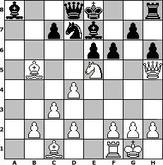 game notation in PGN-format [Event "> 1500"] [Site "www.myChess.de"] [Date "2010.03.18"] [Round "1"] [White "Caligula"] [Black "hape50"] [ECO "D02"] [WhitemyELO "1318"] [BlackmyELO "1238"] [Result "1-0"] [TimeControl "10/2592000"] [WhiteDays "60"] [BlackDays "60"] [MyChessNo "64080"] 1. d4 d5 2. Nf3 h6 3. e3 a6 4. Nc3 e6 5. Bd3 Nf6 6. O-O Be7 7. e4 dxe4 8. Nxe4 Nxe4 9. Bxe4 Nd7 10. c3 Nf6 11. Bd3 b5 12. a4 Bb7 13. axb5 axb5 14. Rxa8 Bxa8 15. Bxb5+ Nd7 16. Ne5 f6 17. Qh5+ 1-0 position notation in FEN-format b2qk2r/2pnb1p1/4pp1p/1B2N2Q/3P4/2P5/1P1P1PPP/2B2RK1 - kq - 1 17 Captured white pieces: Captured black pieces: Click on a captured piece in order to display the desired move!