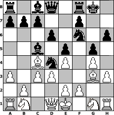 game notation in PGN-format [Event "Gl"] [Site "www.myChess.de"] [Date "2012.06.07"] [Round "1"] [White "faustballer"] [Black "Knight"] [ECO "C23"] [WhitemyELO "1542"] [BlackmyELO "1166"] [Result "1-0"] [TimeControl "10/2592000"] [WhiteDays "60"] [BlackDays "00"] [MyChessNo "82082"] 1. e4 e5 2. Bc4 Bc5 3. h3 Nf6 4. d3 d6 5. g4 O-O 6. Bg5 Nc6 7. a3 h6 8. Bh4 g5 9. Bg3 Nd4 10. c3 1-0 position notation in FEN-format r1bq1rk1/ppp2p2/3p1n1p/2b1p1p1/2BnP1P1/P1PP2BP/1P2PP2/RN1QK1NR - KQ - 0 10 Captured white pieces: ![]() ![]() ![]() ![]() ![]() ![]() ![]() ![]() ![]() ![]() ![]() ![]() ![]() ![]() ![]() Captured black pieces: ![]() ![]() ![]() ![]() ![]() ![]() ![]() ![]() ![]() ![]() ![]() ![]() ![]() ![]() ![]() Click on a captured piece in order to display the desired move!