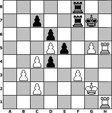 game notation in PGN-format [Event "4. Windeck Open"] [Site "www.myChess.de"] [Date "2011.06.29"] [Round "1"] [White "Jolilein"] [Black "retep1"] [ECO "A16"] [WhitemyELO "1882"] [BlackmyELO "1573"] [Result "1/2-1/2"] [TimeControl "10/864000"] [WhiteDays "39"] [BlackDays "40"] [MyChessNo "74810"] 1. c4 Nf6 2. Nc3 g6 3. e4 d6 4. Nf3 Bg7 5. Be2 O-O 6. O-O e5 7. d4 Nc6 8. d5 Ne7 9. h3 Nd7 10. Bg5 a5 11. Be3 b6 12. h4 Nc5 13. Nd2 f5 14. h5 gxh5 15. Bxh5 Ng6 16. exf5 Bxf5 17. Bxc5 bxc5 18. Nde4 Rb8 19. Rb1 Nf4 20. g3 Nxh5 21. Qxh5 Qe8 22. Qxe8 Rfxe8 23. f3 Rf8 24. Nb5 Rf7 25. Kg2 Bh6 26. Rbd1 Be3 27. b3 h6 28. Rde1 Bd4 29. g4 Bg6 30. Rh1 Kg7 31. g5 h5 32. Nf6 a4 33. Nxh5+ Bxh5 34. Rxh5 axb3 35. axb3 Ra8 36. Nxd4 cxd4 37. Reh1 Raf8 1/2-1/2 position notation in FEN-format 5r2/2p2rk1/3p4/3Pp1PR/2Pp4/1P3P2/2P3K1/7R - - - 2 38 Captured white pieces: Captured black pieces: Click on a captured piece in order to display the desired move!