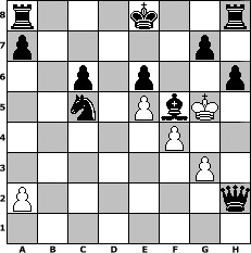 game notation in PGN-format [Event "und immer wieder Schach !"] [Site "www.myChess.de"] [Date "2009.11.06"] [Round "1"] [White "commander"] [Black "neve"] [ECO "A45"] [WhitemyELO "1158"] [BlackmyELO "1476"] [Result "0-1"] [TimeControl "10/864000"] [WhiteDays "22"] [BlackDays "40"] [MyChessNo "60425"] 1. d4 Nf6 2. Nc3 d5 3. f3 e6 4. e4 Bb4 5. Bg5 Be7 6. Qe2 Bb4 7. Bxf6 Bxc3+ 8. bxc3 Qxf6 9. e5 Qh4+ 10. g3 Qe7 11. f4 Qa3 12. Qd3 Bd7 13. c4 Qb2 14. Qd1 Ba4 15. cxd5 Qc3+ 16. Kf2 Bxc2 17. Qc1 Qxd4+ 18. Qe3 Qxa1 19. dxe6 fxe6 20. Bc4 Bf5 21. Qf3 c6 22. Qb3 Qd4+ 23. Ke1 Qd7 24. Ne2 b5 25. Nc3 bxc4 26. Qxc4 Bd3 27. Qc5 Na6 28. Qe3 Nb4 29. Kf2 Bc2 30. Qc5 Nd3+ 31. Kg2 Nxc5 32. Rc1 Qd2+ 33. Kh3 Qxc1 34. Ne2 Qf1+ 35. Kg4 Qxe2+ 36. Kh3 Bf5+ 37. Kh4 Qxh2+ 38. Kg5 h6# 0-1 position notation in FEN-format r3k2r/p5p1/2p1p2p/2n1PbK1/5P2/6P1/P6q/8 - kq - 0 39 Captured white pieces: Captured black pieces: Click on a captured piece in order to display the desired move!