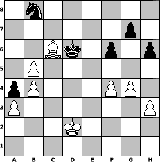 game notation in PGN-format [Event "3. gro"] [Site "www.myChess.de"] [Date "2006.09.17"] [Round "1"] [Board "1"] [White "Caligula"] [Black "Andreas"] [ECO "C24"] [WhitemyELO "1840"] [BlackmyELO "1603"] [Result "1-0"] [TimeControl "10/2592000"] [WhiteDays "30"] [BlackDays "26"] [MyChessNo "28602"] 1. e4 e5 2. Bc4 Nf6 3. Nc3 Bb4 4. a3 Bxc3 5. dxc3 O-O 6. Nf3 d6 7. Bg5 h6 8. Bh4 Bg4 9. Qe2 c6 10. h3 Bh5 11. g4 Bg6 12. O-O-O b5 13. Ba2 a5 14. Nxe5 Bxe4 15. Bxf6 Qxf6 16. Qxe4 Qxe5 17. Qxe5 dxe5 18. Rhe1 Re8 19. f4 e4 20. Rd4 e3 21. Rd3 e2 22. Rd2 Re3 23. Rdxe2 Rxe2 24. Rxe2 Kf8 25. b3 Ra7 26. Rd2 Rd7 27. b4 a4 28. Rd4 Re7 29. c4 Rd7 30. Rxd7 Nxd7 31. cxb5 cxb5 32. Bd5 Nb8 33. c4 Ke7 34. cxb5 f6 35. Bc6 Kd6 36. Kd2 1-0 position notation in FEN-format 1n6/6p1/2Bk1p1p/1P6/pP3PP1/P6P/3K4/8 - - - 3 36 Captured white pieces: Captured black pieces: Click on a captured piece in order to display the desired move!