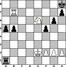 game notation in PGN-format [Event "Weihnachtstunier"] [Site "www.myChess.de"] [Date "2005.12.14"] [Round "1"] [White "Juliette2103"] [Black "NoBody"] [ECO "B00"] [WhitemyELO "1970"] [BlackmyELO "1784"] [Result "1-0"] [TimeControl "10/864000"] [WhiteDays "10"] [BlackDays "10"] [MyChessNo "20720"] 1. e4 b6 2. d4 Bb7 3. Bd3 e6 4. Nf3 c5 5. c3 Nf6 6. e5 Ne4 7. O-O f5 8. Nbd2 Nxd2 9. Bxd2 Be7 10. dxc5 Bxc5 11. Bg5 Be7 12. Bxe7 Qxe7 13. Qe2 Nc6 14. Rad1 O-O 15. Rfe1 Rac8 16. Qe3 Na5 17. Qf4 Bd5 18. Ba6 Rc7 19. a3 Bc4 20. Bxc4 Nxc4 21. Re2 Rfc8 22. Nd4 a6 23. a4 Rc5 24. Rd3 Ra5 25. b3 Nxe5 26. Rxe5 Qd6 27. Rde3 Rxe5 28. Qxe5 Qxe5 29. Rxe5 Rxc3 30. Kf1 Rd3 31. Nf3 Rxb3 32. Re3 Rb1+ 33. Re1 Rb4 34. Rd1 Rxa4 35. Rxd7 g6 36. Ng5 Ra1+ 37. Ke2 a5 38. Nxe6 b5 39. Rg7+ Kh8 40. Rb7 1-0 position notation in FEN-format 7k/1R5p/4N1p1/pp3p2/8/8/4KPPP/r7 - - - 3 40 Captured white pieces: Captured black pieces: Click on a captured piece in order to display the desired move!