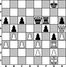 game notation in PGN-format [Event "Sommer 2010"] [Site "www.myChess.de"] [Date "2010.06.15"] [Round "1"] [White "Haki"] [Black "Master1"] [ECO "C64"] [WhitemyELO "1249"] [BlackmyELO "1357"] [Result "0-1"] [TimeControl "10/1728000"] [WhiteDays "80"] [BlackDays "74"] [MyChessNo "66332"] 1. e4 e5 2. Nf3 Nc6 3. Bb5 Bc5 4. O-O Nf6 5. d3 O-O 6. Nbd2 Re8 7. Bc4 h6 8. c3 d6 9. b4 Bb6 10. Qb3 Be6 11. Bxe6 Rxe6 12. Nc4 d5 13. Ne3 Bxe3 14. Bxe3 b5 15. d4 dxe4 16. Nxe5 Nd5 17. Nxc6 Rxc6 18. Rac1 Nxe3 19. fxe3 Rf6 20. Rxf6 Qxf6 21. Rf1 Qe7 22. Rf5 c6 23. Rf4 Re8 24. Qd1 a6 25. Qh5 Rf8 26. Rg4 Qe6 27. h3 g5 28. h4 f5 29. Rg3 g4 30. a3 Rf6 0-1 position notation in FEN-format 6k1/8/p1p1qr1p/1p3p1Q/1P1Pp1pP/P1P1P1R1/4P1P1/6K1 - - - 1 31 Captured white pieces: Captured black pieces: Click on a captured piece in order to display the desired move!
