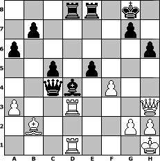 game notation in PGN-format [Event "1600_er unter sich"] [Site "www.myChess.de"] [Date "2005.04.06"] [Round "2"] [White "Lanzelot"] [Black "Armin1960"] [ECO "E10"] [WhitemyELO "1690"] [BlackmyELO "1640"] [Result "0-1"] [TimeControl "10/864000"] [WhiteDays "10"] [BlackDays "10"] [MyChessNo "11838"] 1. d4 Nf6 2. c4 e6 3. Nf3 d5 4. Nc3 Bb4 5. Qc2 O-O 6. e3 Nc6 7. Bd2 Re8 8. Bd3 h6 9. O-O a6 10. a3 dxc4 11. Bxc4 Bd6 12. e4 e5 13. dxe5 Nxe5 14. Nxe5 Bxe5 15. Rad1 Qe7 16. Nd5 Nxd5 17. Bxd5 c6 18. Ba2 Be6 19. Bb4 Qg5 20. Bd2 Qh5 21. f4 Bd4+ 22. Kh1 Bxa2 23. b3 Bxb3 24. Qxb3 Qb5 25. Qh3 Qa4 26. e5 c5 27. Bc1 Rad8 28. Rd3 Qc4 29. Rfd1 f6 30. Bb2 fxe5 0-1 position notation in FEN-format 3rr1k1/1p4p1/p6p/2p1p3/2qb1P2/P2R3Q/1B4PP/3R3K - - - 0 31 Captured white pieces: ![]() ![]() ![]() ![]() ![]() ![]() ![]() ![]() ![]() ![]() ![]() ![]() ![]() ![]() ![]() Captured black pieces: ![]() ![]() ![]() ![]() ![]() ![]() ![]() ![]() ![]() ![]() ![]() ![]() ![]() ![]() ![]() Click on a captured piece in order to display the desired move!