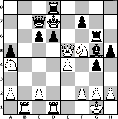 game notation in PGN-format [Event "Trauerspiel :-)"] [Site "www.myChess.de"] [Date "2008.09.20"] [Round "1"] [White "carlo"] [Black "murphy12"] [ECO "C41"] [WhitemyELO "1517"] [BlackmyELO "1524"] [Result "1-0"] [TimeControl "10/864000"] [WhiteDays "10"] [BlackDays "10"] [MyChessNo "48153"] 1. e4 e5 2. Nf3 d6 3. d4 Qe7 4. Nc3 c6 5. Be2 Bg4 6. O-O Nd7 7. Be3 Ngf6 8. Ng5 Bxe2 9. Qxe2 h6 10. Nf3 Ng4 11. Rad1 Nxe3 12. Qxe3 g5 13. dxe5 Nxe5 14. Nd4 Qc7 15. b4 O-O-O 16. b5 Be7 17. bxc6 bxc6 18. Rb1 g4 19. Nf5 Bg5 20. Qd4 Rhg8 21. Qa4 a5 22. Rfd1 Rg6 23. Qd4 h5 24. Na4 Kd7 25. Qxe5 1-0 position notation in FEN-format 3r4/2qk1p2/2pp2r1/p3QNbp/N3P1p1/8/P1P2PPP/1R1R2K1 - - - 0 25 Captured white pieces: Captured black pieces: Click on a captured piece in order to display the desired move!