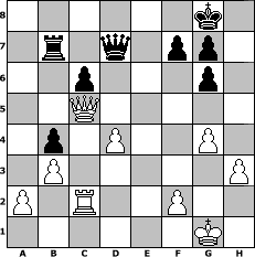 game notation in PGN-format [Event "Herbstturnier 2004"] [Site "www.myChess.de"] [Date "2004.09.02"] [Round "2"] [White "HPB2005"] [Black "kingcrusher"] [ECO "C42"] [WhitemyELO "1928"] [BlackmyELO "1885"] [Result "1-0"] [TimeControl "10/2592000"] [WhiteDays "110"] [BlackDays "101"] [MyChessNo "6557"] 1. e4 e5 2. Nf3 Nf6 3. Nxe5 d6 4. Nf3 Nxe4 5. d4 d5 6. Bd3 Bd6 7. O-O O-O 8. c4 Bg4 9. cxd5 Nf6 10. h3 Bh5 11. g4 Bg6 12. Bxg6 hxg6 13. Qb3 Qc8 14. Re1 Nbd7 15. Nc3 a5 16. Na4 Rb8 17. Qb5 c6 18. dxc6 bxc6 19. Qd3 Re8 20. Rxe8+ Qxe8 21. Bg5 Nd5 22. Re1 Qc8 23. Bd2 Qc7 24. Qa6 Nb4 25. Qc4 Nd5 26. Nc3 N7b6 27. Nxd5 Nxd5 28. b3 Ra8 29. Rc1 Rc8 30. Qa6 Nb4 31. Bxb4 axb4 32. Ne1 Qd7 33. Nd3 Rc7 34. Qb6 Qe8 35. Re1 Qd7 36. Nc5 Bxc5 37. Qxc5 Ra7 38. Re2 Rb7 39. Rc2 1-0 position notation in FEN-format 6k1/1r1q1pp1/2p3p1/2Q5/1p1P2P1/1P5P/P1R2P2/6K1 - - - 4 39 Captured white pieces: ![]() ![]() ![]() ![]() ![]() ![]() ![]() ![]() ![]() ![]() ![]() ![]() ![]() ![]() ![]() Captured black pieces: ![]() ![]() ![]() ![]() ![]() ![]() ![]() ![]() ![]() ![]() ![]() ![]() ![]() ![]() ![]() Click on a captured piece in order to display the desired move!