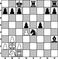 game notation in PGN-format [Event "Rund ums K"] [Site "www.myChess.de"] [Date "2004.09.28"] [Round "2"] [White "OwainGwynedd"] [Black "kalle"] [ECO "C33"] [WhitemyELO "1211"] [BlackmyELO "1663"] [Result "0-1"] [TimeControl "10/2592000"] [WhiteDays "88"] [BlackDays "83"] [MyChessNo "7176"] 1. e4 e5 2. f4 exf4 3. d3 Qh4+ 4. Kd2 Bc5 5. Qe2 Nc6 6. Nf3 Be3+ 7. Kd1 Qh6 8. Na3 d6 9. Nc4 Bxc1 10. Rxc1 Bg4 11. e5 d5 12. Na3 O-O-O 13. Qe1 Re8 14. Be2 Nxe5 15. h3 Nxf3 16. Qf1 Nh2 17. Qf2 Bxe2+ 18. Kd2 f3+ 19. Kc3 Qf6+ 20. d4 fxg2 21. Qxf6 Nxf6 22. Rxh2 Bf1 23. Rxg2 Bxg2 24. b3 Bxh3 25. Nb1 Ne4+ 26. Kb2 f5 0-1 position notation in FEN-format 2k1r2r/ppp3pp/8/3p1p2/3Pn3/1P5b/PKP5/1NR5 - - - 0 27 Captured white pieces: ![]() ![]() ![]() ![]() ![]() ![]() ![]() ![]() ![]() ![]() ![]() ![]() ![]() ![]() ![]() Captured black pieces: ![]() ![]() ![]() ![]() ![]() ![]() ![]() ![]() ![]() ![]() ![]() ![]() ![]() ![]() ![]() Click on a captured piece in order to display the desired move!