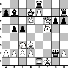 game notation in PGN-format [Event "1.Chess in Friendship"] [Site "www.myChess.de"] [Date "2004.08.10"] [Round "2"] [White "Hobbykegler"] [Black "OwainGwynedd"] [ECO "A40"] [WhitemyELO "1103"] [BlackmyELO "1263"] [Result "0-1"] [TimeControl "10/2592000"] [WhiteDays "66"] [BlackDays "88"] [MyChessNo "6126"] 1. d4 e6 2. e4 d6 3. Nc3 c6 4. Nf3 g6 5. Bc4 Bg7 6. O-O b6 7. Bf4 Bb7 8. Re1 Ne7 9. Ng5 Nd7 10. e5 b5 11. Bd3 Qc7 12. exd6 Qb6 13. dxe7 Bxd4 14. Bd6 Bxf2+ 15. Kf1 Bxe1 16. Qxe1 h6 17. Nge4 f5 18. Ng3 c5 19. Qxe6 Rh7 20. Qg8+ Nf8 21. Qxf8+ Kd7 22. Re1 Re8 23. Nxf5 Qc6 24. Qf6 Qxg2# 0-1 position notation in FEN-format 4r3/pb1kP2r/3B1Qpp/1pp2N2/8/2NB4/PPPP2qP/4RK2 - - - 0 25 Captured white pieces: Captured black pieces: Click on a captured piece in order to display the desired move!