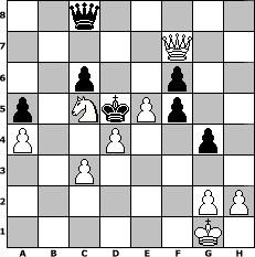 game notation in PGN-format [Event "Februar 2017"] [Site "www.myChess.de"] [Date "2017.02.05"] [Round "1"] [White "Steffi"] [Black "Achimkogge"] [ECO "D10"] [WhitemyELO "1604"] [BlackmyELO "1402"] [Result "1-0"] [TimeControl "10/1728000"] [WhiteDays "43"] [BlackDays "66"] [MyChessNo "106762"] 1. d4 d5 2. c4 c6 3. Nc3 e6 4. Nf3 dxc4 5. e3 b5 6. a4 b4 7. Na2 b3 8. Nc3 Ba6 9. Ne5 Nf6 10. Bxc4 Bxc4 11. Nxc4 Bb4 12. Qxb3 a5 13. O-O O-O 14. Bd2 Na6 15. f3 Rb8 16. Qc2 g6 17. Ne5 Rc8 18. Qd3 Nc5 19. Qe2 Nb3 20. Rad1 Nxd2 21. Qxd2 Nd5 22. Rc1 f6 23. Nd3 Bxc3 24. bxc3 Rb8 25. e4 Ne7 26. Nc5 Qc8 27. Rb1 Rxb1 28. Rxb1 g5 29. f4 g4 30. Rb7 Ng6 31. f5 exf5 32. Qh6 Rf7 33. Rxf7 Kxf7 34. Qxh7+ Kf8 35. Qxg6 Ke7 36. Qg7+ Kd6 37. e5+ Kd5 38. Qf7+ 1-0 position notation in FEN-format 2q5/5Q2/2p2p2/p1NkPp2/P2P2p1/2P5/6PP/6K1 - - - 2 38 Captured white pieces: Captured black pieces: Click on a captured piece in order to display the desired move!