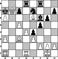 game notation in PGN-format [Event "CAISSA.COM IS DEAD TO ME!"] [Site "www.myChess.de"] [Date "2020.03.28"] [Round "1"] [White "Seneca"] [Black "borsti"] [ECO "D00"] [WhitemyELO "1570"] [BlackmyELO "1244"] [Result "1-0"] [TimeControl "10/2592000"] [WhiteDays "30"] [BlackDays "30"] [MyChessNo "117680"] 1. d4 d5 2. e3 a6 3. c4 Nf6 4. Nc3 Bf5 5. Nf3 e6 6. a3 Nc6 7. c5 Na5 8. Nh4 Ne4 9. Nxf5 Qf6 10. Nxe4 dxe4 11. Ng3 Qg6 12. Be2 O-O-O 13. Bh5 Qf5 14. Nxf5 exf5 15. Bxf7 g6 16. Bd2 Nc6 17. O-O Be7 18. Bc3 Rhf8 19. Be6+ Kb8 20. b4 Bf6 21. Qb3 Ne7 22. Rfd1 Nc6 23. b5 Ne7 24. bxa6 Ka7 25. Qxb7# 1-0 position notation in FEN-format 3r1r2/kQp1n2p/P3Bbp1/2P2p2/3Pp3/P1B1P3/5PPP/R2R2K1 - - - 0 25 Captured white pieces: Captured black pieces: Click on a captured piece in order to display the desired move!