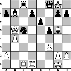 game notation in PGN-format [Event "Vor dem Urlaub noch ein schnelles Turnier!"] [Site "www.myChess.de"] [Date "2012.06.16"] [Round "1"] [White "Tigerle"] [Black "Naunhofer"] [ECO "B20"] [WhitemyELO "1521"] [BlackmyELO "1627"] [Result "1-0"] [TimeControl "10/864000"] [WhiteDays "06"] [BlackDays "10"] [MyChessNo "82236"] 1. e4 c5 2. d4 cxd4 3. c3 dxc3 4. Nxc3 e6 5. Nf3 Nc6 6. Bc4 Qc7 7. O-O Nf6 8. Nb5 Qb8 9. e5 Ne4 10. Re1 Nc5 11. Nd6+ Bxd6 12. exd6 b5 13. Bd5 Qxd6 14. Ng5 O-O 15. Qc2 f5 16. Bxc6 Qxc6 17. Qe2 Bb7 18. f3 Rf6 19. Be3 Rg6 20. Rac1 Rxg5 21. Bxg5 Qd6 22. Red1 Qf8 23. Qxb5 Rc8 24. b4 1-0 position notation in FEN-format 2r2qk1/pb1p2pp/4p3/1Qn2pB1/1P6/5P2/P5PP/2RR2K1 - - - 0 24 Captured white pieces: Captured black pieces: Click on a captured piece in order to display the desired move!