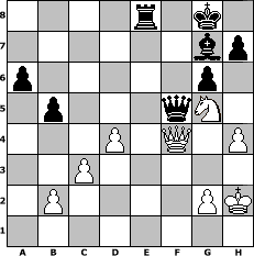 game notation in PGN-format [Event "Weinprobe 2018"] [Site "www.myChess.de"] [Date "2018.10.01"] [Round "1"] [White "Andylein1989"] [Black "Rotstift10"] [ECO "B10"] [WhitemyELO "1648"] [BlackmyELO "1608"] [Result "0-1"] [TimeControl "10/1728000"] [WhiteDays "20"] [BlackDays "16"] [MyChessNo "113180"] 1. e4 c6 2. Nf3 g6 3. Bc4 Bg7 4. d4 d5 5. exd5 cxd5 6. Bb5+ Bd7 7. Nc3 Nf6 8. O-O Bxb5 9. Nxb5 a6 10. Nc3 O-O 11. Re1 Nc6 12. h3 e6 13. Be3 Qc7 14. Qc1 Rfe8 15. Ne2 Nb4 16. c3 Nd3 17. Qd2 Nxe1 18. Rxe1 b5 19. Ng3 Ne4 20. Nxe4 dxe4 21. Ng5 Qc4 22. h4 Qxa2 23. Bf4 f5 24. f3 Rad8 25. fxe4 e5 26. exf5 exf4 27. Rxe8+ Rxe8 28. Qxf4 Qb1+ 29. Kh2 Qxf5 0-1 position notation in FEN-format 4r1k1/6bp/p5p1/1p3qN1/3P1Q1P/2P5/1P4PK/8 - - - 0 30 Captured white pieces: Captured black pieces: Click on a captured piece in order to display the desired move!