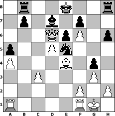 game notation in PGN-format [Event "Es wurde noch etwas sommerlich."] [Site "www.myChess.de"] [Date "2009.08.09"] [Round "1"] [White "nyffhans"] [Black "freizeitspieler"] [ECO "D02"] [WhitemyELO "1586"] [BlackmyELO "1562"] [Result "1-0"] [TimeControl "10/2592000"] [WhiteDays "30"] [BlackDays "14"] [MyChessNo "58181"] 1. d4 d5 2. Nf3 Nc6 3. e3 Nf6 4. c4 dxc4 5. Bxc4 e6 6. Nc3 Bb4 7. a3 Bxc3+ 8. bxc3 Nd5 9. e4 Nb6 10. Bd3 Bd7 11. Qc2 h6 12. O-O g5 13. a4 a5 14. Ba3 Qf6 15. Bc5 g4 16. Nd2 Nc8 17. e5 Qg5 18. Ne4 Qf4 19. g3 Qf3 20. Nf6+ Kd8 21. Be4 Qxf6 22. exf6 Nd6 23. Bxd6 cxd6 24. d5 Ne5 25. Qb3 Rb8 26. Qb6+ Ke8 27. Qxd6 1-0 position notation in FEN-format 1r2k2r/1p1b1p2/3QpP1p/p2Pn3/P3B1p1/2P3P1/5P1P/R4RK1 - - - 0 27 Captured white pieces: Captured black pieces: Click on a captured piece in order to display the desired move!