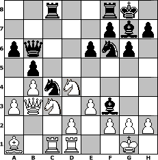 game notation in PGN-format [Event "Für die kalten Tage..."] [Site "www.myChess.de"] [Date "2018.02.09"] [Round "2"] [White "FrankB"] [Black "Joschi"] [ECO "A48"] [WhitemyELO "1706"] [BlackmyELO "1544"] [Result "0-1"] [TimeControl "10/1728000"] [WhiteDays "00"] [BlackDays "20"] [MyChessNo "111368"] 1. d4 Nf6 2. Nf3 g6 3. e3 d5 4. c4 e6 5. a3 Bg7 6. Nc3 O-O 7. Be2 dxc4 8. Bxc4 Nbd7 9. O-O c5 10. Qc2 cxd4 11. Nxd4 a6 12. Rd1 Qc7 13. Be2 b5 14. b4 Bb7 15. Bb2 Rac8 16. Rac1 Nb6 17. Qb3 Nc4 18. Ba1 Qb6 19. Bf3 Bxf3 0-1 position notation in FEN-format 2r2rk1/5pbp/pq2pnp1/1p6/1PnN4/PQN1Pb2/3P1PPP/B1RR2K1 - - - 0 20 Captured white pieces: Captured black pieces: Click on a captured piece in order to display the desired move!