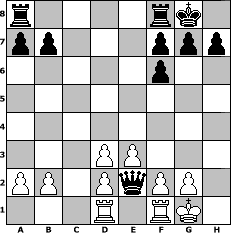 game notation in PGN-format [Event "Vor dem Urlaub noch ein schnelles Turnier!"] [Site "www.myChess.de"] [Date "2012.06.16"] [Round "1"] [White "reisender"] [Black "ElisabethPeters"] [ECO "A45"] [WhitemyELO "1346"] [BlackmyELO "1572"] [Result "0-1"] [TimeControl "10/864000"] [WhiteDays "09"] [BlackDays "09"] [MyChessNo "82233"] 1. d4 Nf6 2. Nc3 d5 3. Bg5 c5 4. Bxf6 exf6 5. e3 Nc6 6. dxc5 Be6 7. Bb5 Bxc5 8. Nge2 O-O 9. O-O Bd6 10. Nxd5 Bxd5 11. Qxd5 Bxh2+ 12. Kxh2 Qxd5 13. Bd3 Nb4 14. Rad1 Nxd3 15. cxd3 Qh5+ 16. Kg1 Qxe2 0-1 position notation in FEN-format r4rk1/pp3ppp/5p2/8/8/3PP3/PP1PqPP1/3R1RK1 - - - 0 17 Captured white pieces: Captured black pieces: Click on a captured piece in order to display the desired move!