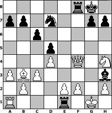 game notation in PGN-format [Event "Skandinavium II"] [Site "www.myChess.de"] [Date "2006.01.06"] [Round "1"] [White "Seneca"] [Black "myfairlady"] [ECO "B01"] [WhitemyELO "1672"] [BlackmyELO "1881"] [Result "0-1"] [TimeControl "10/864000"] [WhiteDays "10"] [BlackDays "10"] [MyChessNo "21421"] 1. e4 d5 2. exd5 Qxd5 3. Nc3 Qa5 4. d4 Nf6 5. Bd2 Bf5 6. Nf3 Nbd7 7. Bc4 c6 8. a3 e6 9. O-O Qc7 10. Be3 Bd6 11. g3 Nd5 12. Nxd5 exd5 13. Bb3 O-O 14. c3 Rae8 15. Nh4 Bh3 16. Re1 f5 17. Qd2 f4 18. Bxf4 Bxf4 19. gxf4 Qxf4 20. Qxf4 Rxe1+ 0-1 position notation in FEN-format 5rk1/pp1n2pp/2p5/3p4/3P1Q1N/PBP4b/1P2PP1P/R3r1K1 - - - 0 21 Captured white pieces: Captured black pieces: Click on a captured piece in order to display the desired move!