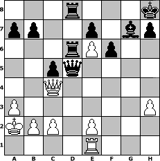 game notation in PGN-format [Event "MySchachOpen"] [Site "www.myChess.de"] [Date "2005.01.22"] [Round "1"] [White "Falcor"] [Black "Robur"] [ECO "B03"] [WhitemyELO "1337"] [BlackmyELO "1655"] [Result "0-1"] [TimeControl "10/2592000"] [WhiteDays "105"] [BlackDays "117"] [MyChessNo "9852"] 1. e4 Nf6 2. e5 Nd5 3. d4 d6 4. Bc4 Nb6 5. Nf3 Nxc4 6. Nbd2 Nxd2 7. Bxd2 dxe5 8. dxe5 Bg4 9. h3 Bxf3 10. Qxf3 Nc6 11. e6 f6 12. O-O-O Qc8 13. Rhe1 g6 14. Bg5 Bg7 15. Qf4 O-O 16. Bh4 g5 17. Qg4 Ne5 18. Qb4 c5 19. Qb3 gxh4 20. Re4 Bh6+ 21. Kb1 Kh8 22. Rxh4 Bg7 23. Re1 Rd8 24. f4 Ng6 25. Rh5 Nxf4 26. Rh4 Nxg2 27. Re4 Nxe1 28. Rxe1 Qc6 29. a3 Rd6 30. Qc4 Rad8 31. Ka2 Qd5 0-1 position notation in FEN-format 3r3k/pp2p1bp/3rPp2/2pq4/2Q5/P6P/KPP1P3/4R3 - - - 5 32 Captured white pieces: Captured black pieces: Click on a captured piece in order to display the desired move!
