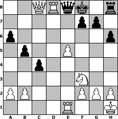 game notation in PGN-format [Event "Mit Freude am Spiel 2..!"] [Site "www.myChess.de"] [Date "2014.11.15"] [Round "2"] [White "muellerh"] [Black "Joschi"] [ECO "B12"] [WhitemyELO "1471"] [BlackmyELO "1575"] [Result "1-0"] [TimeControl "10/864000"] [WhiteDays "10"] [BlackDays "10"] [MyChessNo "96698"] 1. e4 c6 2. d4 d5 3. e5 Bf5 4. Nf3 e6 5. Be2 Nd7 6. O-O Rc8 7. c4 dxc4 8. Bxc4 Ne7 9. Nc3 a6 10. Bg5 h6 11. Bh4 b5 12. Bd3 Bxd3 13. Qxd3 Qb6 14. Kh1 c5 15. Rad1 c4 16. Qd2 Nc6 17. d5 exd5 18. Nxd5 Qc5 19. Rfe1 Be7 20. Nxe7 Nxe7 21. Qxd7+ Kf8 22. Bxe7+ Qxe7 23. Qxc8+ Qe8 24. Rd8 1-0 position notation in FEN-format 2QRqk1r/5pp1/p6p/1p2P3/2p5/5N2/PP3PPP/4R2K - - - 2 24 Captured white pieces: Captured black pieces: Click on a captured piece in order to display the desired move!