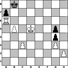 game notation in PGN-format [Event "Wems gef"] [Site "www.myChess.de"] [Date "2006.01.13"] [Round "2"] [White "Robur"] [Black "Juri"] [Variant "Fischerrandom"] [SetUp "1"] [FEN "nbrkqnbr/pppppppp/8/8/8/8/PPPPPPPP/NBRKQNBR w KQkq - 0 1"] [WhitemyELO "1701"] [BlackmyELO "1553"] [Result "1-0"] [TimeControl "10/864000"] [WhiteDays "08"] [BlackDays "09"] [MyChessNo "21661"] 1. e4 e5 2. f3 Ng6 3. Bf2 Nb6 4. Nb3 Nc4 5. Ne3 Nxb2+ 6. Ke2 d6 7. d3 Nf4+ 8. Kf1 f5 9. Nxf5 Qb5 10. g3 Bxb3 11. axb3 Ne6 12. Qc3 Nxd3 13. Qxd3 Qa5 14. Qd5 Qxd5 15. exd5 Ng5 16. Kg2 g6 17. Ng7 Ke7 18. f4 Ne4 19. fxe5 Nxf2 20. Kxf2 Rhf8+ 21. Kg2 dxe5 22. Rce1 c6 23. Ne6 Rf6 24. Nf4 Kd6 25. Nd3 Kxd5 26. c3 c5 27. Nf2 b5 28. Be4+ Ke6 29. Bf3 Rcf8 30. Bg4+ Ke7 31. Ne4 Rc6 32. Rhf1 Rd8 33. Rd1 Bd6 34. Rf6 h5 35. Re6+ Kf7 36. Rdxd6 Rcxd6 37. Nxd6+ Rxd6 38. Rxd6 hxg4 39. Ra6 e4 40. Kf2 g5 41. Ke3 Ke7 42. Kxe4 c4 43. b4 Kd7 44. Kd5 Kc7 45. Kc5 Kb7 46. Kxb5 Kb8 47. Kxc4 Kb7 48. b5 Kb8 49. Kd5 1-0 position notation in FEN-format 1k6/p7/R7/1P1K2p1/6p1/2P3P1/7P/8 - - - 2 49 Captured white pieces: Captured black pieces: Click on a captured piece in order to display the desired move!