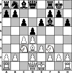 game notation in PGN-format [Event "Zwischendurch mal ein paar eigene Z"] [Site "www.myChess.de"] [Date "2007.11.12"] [Round "1"] [White "WalterKelsch7"] [Black "Andylein1989"] [ECO "D06"] [WhitemyELO "1808"] [BlackmyELO "1427"] [Result "1/2-1/2"] [TimeControl "10/1728000"] [WhiteDays "07"] [BlackDays "17"] [MyChessNo "39761"] 1. d4 d5 2. c4 Nf6 3. Nf3 c6 4. Nc3 e6 5. Bg5 Be7 6. e3 h6 7. Bxf6 Bxf6 8. Bd3 O-O 1/2-1/2 position notation in FEN-format rnbq1rk1/pp3pp1/2p1pb1p/3p4/2PP4/2NBPN2/PP1P1PPP/R2QK2R - KQ - 2 9 Captured white pieces: Captured black pieces: Click on a captured piece in order to display the desired move!