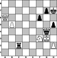 game notation in PGN-format [Event "3. Norderstedter DENK MAL Open 2012"] [Site "www.myChess.de"] [Date "2012.02.08"] [Round "1"] [White "Joschi"] [Black "Winston"] [ECO "B28"] [WhitemyELO "1587"] [BlackmyELO "1498"] [Result "0-1"] [TimeControl "10/2592000"] [WhiteDays "30"] [BlackDays "30"] [MyChessNo "79814"] 1. e4 c5 2. Nf3 a6 3. d4 cxd4 4. Nxd4 e6 5. Be2 Bd6 6. O-O Qh4 7. f4 Bc5 8. Be3 Nc6 9. Qd3 Qe7 10. Nxc6 bxc6 11. Nc3 Bxe3+ 12. Qxe3 Bb7 13. Rad1 Rd8 14. a3 d5 15. Na4 a5 16. Nc5 Ba8 17. Bf3 Nf6 18. exd5 cxd5 19. Rfe1 O-O 20. Nb3 Qc7 21. Qc5 Qxf4 22. Qxa5 Ng4 23. Bxg4 Qxg4 24. Qd2 Rfe8 25. Qe2 Qg6 26. Nd4 e5 27. Nb5 Re7 28. c4 Qb6+ 29. Kh1 e4 30. a4 Qc5 31. cxd5 Bxd5 32. Rc1 Qb6 33. Nc3 Bb7 34. Qb5 Qg6 35. Rcd1 Rde8 36. b4 e3 37. Qe2 Re5 38. Rg1 Rg5 39. Qxe3 f6 40. Qf2 h5 41. Ne2 Qc2 42. Qb6 Bxg2+ 43. Rxg2 Qxd1+ 44. Ng1 Rxg2 45. Kxg2 Qxa4 46. Nf3 Qc2+ 47. Kg3 Qg6+ 48. Kf2 Kh7 49. b5 Qf5 50. Qc6 Rc8 51. Qa6 Rc2+ 52. Ke3 Qc5+ 53. Kf4 Qb4+ 54. Kg3 Qg4# 0-1 position notation in FEN-format 8/6pk/Q4p2/1P5p/6q1/5NK1/2r4P/8 - - - 11 55 Captured white pieces: ![]() ![]() ![]() ![]() ![]() ![]() ![]() ![]() ![]() ![]() ![]() ![]() ![]() ![]() ![]() Captured black pieces: ![]() ![]() ![]() ![]() ![]() ![]() ![]() ![]() ![]() ![]() ![]() ![]() ![]() ![]() ![]() Click on a captured piece in order to display the desired move!