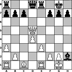game notation in PGN-format [Event "Advents-Open 2011"] [Site "www.myChess.de"] [Date "2011.11.27"] [Round "1"] [White "ndziemba"] [Black "Master1"] [ECO "A06"] [WhitemyELO "1591"] [BlackmyELO "1264"] [Result "0-1"] [TimeControl "10/864000"] [WhiteDays "10"] [BlackDays "10"] [MyChessNo "77736"] 1. Nf3 d5 2. d4 Nc6 3. Nc3 Nf6 4. e3 Bf5 5. Bd3 Bxd3 6. cxd3 e6 7. O-O Bd6 8. Re1 O-O 9. a3 e5 10. dxe5 Nxe5 11. d4 Nxf3+ 12. Qxf3 Re8 13. Nxd5 Nxd5 14. Qxd5 Bxh2+ 0-1 position notation in FEN-format r2qr1k1/ppp2ppp/8/3Q4/3P4/P3P3/1P3PPb/R1B1R1K1 - - - 0 15 Captured white pieces: ![]() ![]() ![]() ![]() ![]() ![]() ![]() ![]() ![]() ![]() ![]() ![]() ![]() ![]() ![]() Captured black pieces: ![]() ![]() ![]() ![]() ![]() ![]() ![]() ![]() ![]() ![]() ![]() ![]() ![]() ![]() ![]() Click on a captured piece in order to display the desired move!