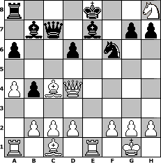 game notation in PGN-format [Event "Alt Benoni"] [Site "www.myChess.de"] [Date "2017.09.25"] [Round "1"] [White "espero"] [Black "Joschi"] [ECO "A43"] [WhitemyELO "1995"] [BlackmyELO "1576"] [Result "1-0"] [TimeControl "10/2592000"] [WhiteDays "41"] [BlackDays "60"] [MyChessNo "109692"] 1. d4 c5 2. d5 Nf6 3. Nf3 c4 4. Nc3 a6 5. e4 b5 6. e5 Ng8 7. a4 b4 8. Ne4 Qc7 9. Qd4 Bb7 10. Bxc4 d6 11. O-O dxe5 12. Nxe5 Nd7 13. d6 exd6 14. Nxf7 Ngf6 15. Nxf6+ Nxf6 16. Re1+ Be7 17. Nxh8 1-0 position notation in FEN-format r3k2N/1bq1b1pp/p2p1n2/8/PpBQ4/8/1PPP1PPP/R1B1R1K1 - kq - 0 17 Captured white pieces: Captured black pieces: Click on a captured piece in order to display the desired move!