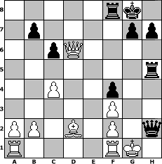 game notation in PGN-format [Event "Anderssen-Club-Meisterschaft"] [Site "www.myChess.de"] [Date "2006.04.11"] [Round "1"] [White "Joschi"] [Black "HPB2005"] [ECO "B18"] [WhitemyELO "1793"] [BlackmyELO "1932"] [Result "0-1"] [TimeControl "10/864000"] [WhiteDays "10"] [BlackDays "08"] [MyChessNo "24454"] 1. e4 c6 2. d4 d5 3. Nc3 dxe4 4. Nxe4 Bf5 5. Ng3 Bg6 6. Nf3 Nf6 7. Bd3 Nbd7 8. c3 e6 9. h3 Qc7 10. O-O Bd6 11. Ne2 Bh5 12. Nd2 O-O 13. Ne4 Nxe4 14. Bxe4 Rac8 15. Qd3 f5 16. Bf3 Bg6 17. Bd2 e5 18. dxe5 Nxe5 19. Qe3 f4 20. Qxa7 Ra8 21. Qd4 Ra5 22. c4 Nxf3+ 23. gxf3 Rh5 24. Kh2 Qc8 25. Ng1 Bf5 26. Qxd6 Bxh3 27. Nxh3 Qxh3+ 28. Kg1 Qh2# 0-1 position notation in FEN-format 5rk1/1p4pp/2pQ4/7r/2P2p2/5P2/PP1B1P1q/R4RK1 - - - 2 29 Captured white pieces: ![]() ![]() ![]() ![]() ![]() ![]() ![]() ![]() ![]() ![]() ![]() ![]() ![]() ![]() ![]() Captured black pieces: ![]() ![]() ![]() ![]() ![]() ![]() ![]() ![]() ![]() ![]() ![]() ![]() ![]() ![]() ![]() Click on a captured piece in order to display the desired move!