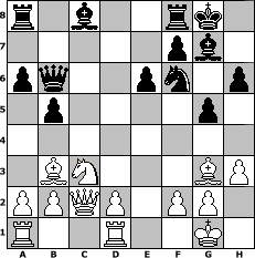 game notation in PGN-format [Event "wie w"] [Site "www.myChess.de"] [Date "2013.11.16"] [Round "1"] [White "Robert"] [Black "Joschi"] [ECO "A56"] [WhitemyELO "1495"] [BlackmyELO "1574"] [Result "0-1"] [TimeControl "10/1728000"] [WhiteDays "00"] [BlackDays "19"] [MyChessNo "91140"] 1. d4 Nf6 2. c4 c5 3. e3 cxd4 4. exd4 d5 5. Nf3 g6 6. Nc3 Bg7 7. h3 O-O 8. Qb3 dxc4 9. Bxc4 e6 10. O-O Nc6 11. Bg5 Qc7 12. Qc2 h6 13. Nb5 Qd8 14. Bh4 a6 15. Nc3 g5 16. Bg3 Nxd4 17. Nxd4 Qxd4 18. Bb3 b5 19. Rfd1 Qb6 0-1 position notation in FEN-format r1b2rk1/5pb1/pq2pn1p/1p4p1/8/1BN3BP/PPQP1PP1/R2R2K1 - - - 2 20 Captured white pieces: Captured black pieces: Click on a captured piece in order to display the desired move!