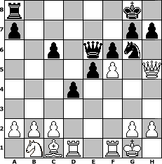 game notation in PGN-format [Event "Neues Jahr neue Er"] [Site "www.myChess.de"] [Date "2017.01.06"] [Round "1"] [White "alibengali"] [Black "Knight"] [ECO "A00"] [WhitemyELO "1674"] [BlackmyELO "1200"] [Result "1-0"] [TimeControl "10/2592000"] [WhiteDays "82"] [BlackDays "90"] [MyChessNo "106380"] 1. Nc3 d5 2. e4 dxe4 3. Nxe4 Nc6 4. Bb5 e5 5. Nf3 Bd6 6. d4 Bd7 7. d5 Nge7 8. dxc6 Bxc6 9. Bxc6+ bxc6 10. O-O O-O 11. Nfg5 f6 12. Ne6 Qd7 13. Nxf8 Kxf8 14. Qh5 Kg8 15. Bh6 Ng6 16. Rad1 Qe6 17. Nxd6 cxd6 18. Bc1 d5 19. f4 d4 20. f5 1-0 position notation in FEN-format r5k1/p5pp/2p1qpn1/4pP1Q/3p4/8/PPP3PP/1NBR1RK1 - - - 0 20 Captured white pieces: Captured black pieces: Click on a captured piece in order to display the desired move!