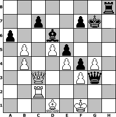 game notation in PGN-format [Event "Zwischendurch mal ein paar eigene Z"] [Site "www.myChess.de"] [Date "2009.06.25"] [Round "1"] [White "Seneca"] [Black "wiesel"] [ECO "D20"] [WhitemyELO "1400"] [BlackmyELO "1384"] [Result "1/2-1/2"] [TimeControl "10/1728000"] [WhiteDays "75"] [BlackDays "88"] [MyChessNo "56948"] 1. d4 d5 2. c4 dxc4 3. Nc3 e6 4. e4 e5 5. d5 Bd6 6. Bxc4 Nf6 7. Bg5 O-O 8. Nf3 Nbd7 9. O-O h6 10. Bh4 Re8 11. a3 a6 12. h3 Nc5 13. b4 Ncd7 14. Rc1 Nb6 15. Bb3 Bd7 16. Re1 Qc8 17. Kh2 Qd8 18. Nd2 g5 19. Bg3 h5 20. f3 h4 21. Bf2 Nh5 22. Nf1 Qc8 23. Ne3 Nf4 24. Ng4 Rf8 25. Nf6+ Kg7 26. Nxd7 Nxd7 27. Ne2 Nf6 28. Nxf4 gxf4 29. Bxh4 Nh5 30. Rg1 Rh8 31. Bf2 Rh6 32. g4 Nf6 33. Qf1 Qd7 34. Bc5 Rah8 35. Rh1 Ne8 36. Kg2 Be7 37. Qc4 Nd6 38. Bxd6 Bxd6 39. a4 b5 40. Qc6 Qe7 41. axb5 Qh4 42. Bd1 Qg3+ 43. Kf1 Rxh3 44. Rxh3 Rxh3 45. Qc3 Rh2 46. Rc2 Rh8 1/2-1/2 position notation in FEN-format 7r/2p2pk1/p2b4/1P1Pp3/1P2PpP1/2Q2Pq1/2R5/3B1K2 - - - 4 47 Captured white pieces: Captured black pieces: Click on a captured piece in order to display the desired move!