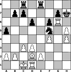 game notation in PGN-format [Event "mySchachR5 (1600-1900)"] [Site "www.myChess.de"] [Date "2009.07.10"] [Round "1"] [White "Schachfedi"] [Black "Nowak"] [ECO "C42"] [WhitemyELO "1864"] [BlackmyELO "1704"] [Result "1/2-1/2"] [TimeControl "10/1728000"] [WhiteDays "16"] [BlackDays "20"] [MyChessNo "57350"] 1. e4 e5 2. Nf3 Nf6 3. Nc3 Bb4 4. Nxe5 O-O 5. Nd3 Bxc3 6. dxc3 Nxe4 7. Be3 d6 8. Qf3 Re8 9. O-O-O Nd7 10. h3 Ndf6 11. Nc5 Nxc5 12. Bxc5 Nd7 13. Be3 Ne5 14. Qg3 Bf5 15. f4 Ng6 16. Bd3 Bxd3 17. cxd3 a5 18. h4 Ne7 19. Qg4 Qc8 20. Qxc8 Raxc8 21. g4 h5 22. gxh5 f6 23. Rhg1 Kh7 24. Bd2 Nf5 25. Rg6 1/2-1/2 position notation in FEN-format 2r1r3/1pp3pk/3p1pR1/p4n1P/5P1P/2PP4/PP1BP3/2KR4 - - - 5 25 Captured white pieces: Captured black pieces: Click on a captured piece in order to display the desired move!