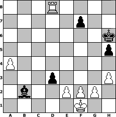 game notation in PGN-format [Event "M"] [Site "www.myChess.de"] [Date "2013.09.19"] [Round "1"] [White "martinus"] [Black "Tomino"] [ECO "B12"] [WhitemyELO "1763"] [BlackmyELO "1706"] [Result "1-0"] [TimeControl "10/3456000"] [WhiteDays "40"] [BlackDays "38"] [MyChessNo "90354"] 1. e4 c6 2. d4 d5 3. e5 c5 4. dxc5 Nc6 5. Bb5 e6 6. Be3 Nge7 7. Nf3 Bd7 8. O-O Nxe5 9. Nxe5 Bxb5 10. Re1 Nc6 11. Nxc6 Bxc6 12. b4 a5 13. c3 axb4 14. cxb4 b6 15. Qc2 d4 16. Rd1 bxc5 17. Rxd4 Qb6 18. Rc4 Bd5 19. bxc5 Qc6 20. Rg4 h5 21. Rg5 Be7 22. Rg3 Bf6 23. Nc3 O-O 24. Rd1 Rfd8 25. Nxd5 Rxd5 26. Rb1 Be7 27. h3 Bxc5 28. Rc1 Rc8 29. Bh6 g6 30. Rxg6+ Kh8 31. Qb2+ Bd4 32. Rxc6 Bxb2 33. Rxc8+ Kh7 34. Rg5 Kxh6 35. Rxd5 exd5 36. a4 d4 37. Kf1 d3 38. Rd8 1-0 position notation in FEN-format 3R4/5p2/7k/7p/P7/3p3P/1b2PPP1/5K2 - - - 1 38 Captured white pieces: Captured black pieces: Click on a captured piece in order to display the desired move!