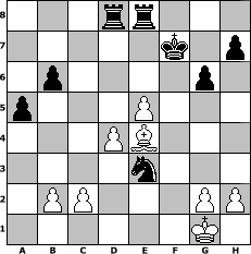 game notation in PGN-format [Event "Neues Jahr 2010"] [Site "www.myChess.de"] [Date "2010.01.01"] [Round "1"] [White "Hobbykegler"] [Black "Schefsche"] [ECO "A00"] [WhitemyELO "1044"] [BlackmyELO "1353"] [Result "0-1"] [TimeControl "10/3456000"] [WhiteDays "138"] [BlackDays "146"] [MyChessNo "62028"] 1. c3 e5 2. d4 exd4 3. cxd4 Bb4+ 4. Bd2 Bxd2+ 5. Qxd2 d5 6. e3 Nf6 7. Bd3 O-O 8. Nf3 c6 9. O-O a6 10. Na3 a5 11. Rac1 Na6 12. Ne5 Nb4 13. Bb1 Ne4 14. Qe2 b6 15. f3 Nf6 16. Nxc6 Nxc6 17. Nb5 Ba6 18. a4 Qe7 19. Rfe1 Bxb5 20. axb5 Nb4 21. e4 Rfe8 22. Rf1 dxe4 23. fxe4 Rad8 24. e5 Nfd5 25. Qf3 Nc7 26. Qf5 g6 27. Qe4 Nxb5 28. Rc4 Nd6 29. Qe2 Nxc4 30. Qxc4 Nd5 31. Be4 Ne3 32. Qxf7+ Qxf7 33. Rxf7 Kxf7 0-1 position notation in FEN-format 3rr3/5k1p/1p4p1/p3P3/3PB3/4n3/1PP3PP/6K1 - - - 0 34 Captured white pieces: Captured black pieces: Click on a captured piece in order to display the desired move!