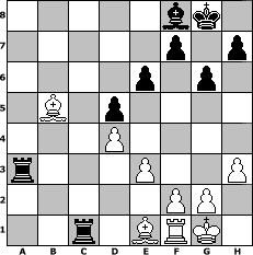 game notation in PGN-format [Event "Hitzeschlacht"] [Site "www.myChess.de"] [Date "2009.08.13"] [Round "1"] [White "Seneca"] [Black "beowulf"] [ECO "D10"] [WhitemyELO "1456"] [BlackmyELO "1368"] [Result "0-1"] [TimeControl "10/864000"] [WhiteDays "09"] [BlackDays "10"] [MyChessNo "58252"] 1. d4 d5 2. c4 c6 3. e3 Nf6 4. Nc3 g6 5. Nf3 Bg7 6. Be2 O-O 7. O-O Bg4 8. cxd5 Nxd5 9. Nxd5 cxd5 10. h3 Bxf3 11. Bxf3 e6 12. a3 Nd7 13. Qb3 Nb6 14. Bd2 Qd7 15. Rac1 Nc4 16. Bb4 Rfc8 17. Be2 a5 18. Be1 a4 19. Qa2 b5 20. b3 axb3 21. Qxb3 Bf8 22. Bxc4 Rxa3 23. Qxb5 Qxb5 24. Bxb5 Rxc1 0-1 position notation in FEN-format 5bk1/5p1p/4p1p1/1B1p4/3P4/r3P2P/5PP1/2r1BRK1 - - - 0 25 Captured white pieces: Captured black pieces: Click on a captured piece in order to display the desired move!