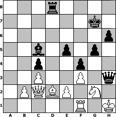 game notation in PGN-format [Event "Pott Schach - Glück Auf die xte."] [Site "www.myChess.de"] [Date "2020.11.05"] [Round "1"] [White "faustballer"] [Black "miu"] [ECO "C01"] [WhitemyELO "1547"] [BlackmyELO "1520"] [Result "0-1"] [TimeControl "10/2592000"] [WhiteDays "118"] [BlackDays "115"] [MyChessNo "119731"] 1. e4 e6 2. d4 d5 3. exd5 Qxd5 4. Nf3 Nf6 5. a3 Bd7 6. Nc3 Qa5 7. Bd2 c5 8. Ne4 Qd8 9. Nxf6+ Qxf6 10. c3 cxd4 11. Nxd4 Bc5 12. Be3 Nc6 13. Bb5 e5 14. Bxc6 bxc6 15. Nc2 Bd6 16. O-O Rd8 17. Qd2 h6 18. Rae1 O-O 19. Bxa7 Be6 20. Be3 Bxa3 21. Qc1 Be7 22. Rd1 c5 23. Rxd8 Rxd8 24. h3 Qg6 25. Kh1 f5 26. Rg1 f4 27. Bd2 c4 28. Ne1 Bc5 29. Rf1 Qh5 30. Kh2 g5 31. f3 Qh4 32. Qc2 Kg7 33. Qc1 Qg3+ 34. Kh1 Bxh3 35. Qc2 Bxg2+ 36. Nxg2 Qh3# 0-1 position notation in FEN-format 3r4/6k1/7p/2b1p1p1/2p2p2/2P2P1q/1PQBP1N1/5R1K - - - 1 37 Captured white pieces: Captured black pieces: Click on a captured piece in order to display the desired move!