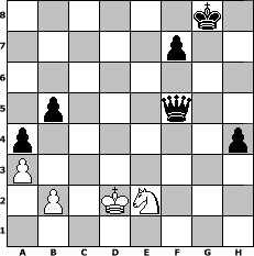 game notation in PGN-format [Event "wie w"] [Site "www.myChess.de"] [Date "2013.11.16"] [Round "1"] [White "Winston"] [Black "Vahl1"] [ECO "C42"] [WhitemyELO "1550"] [BlackmyELO "1667"] [Result "0-1"] [TimeControl "10/1728000"] [WhiteDays "19"] [BlackDays "20"] [MyChessNo "91119"] 1. e4 e5 2. Nf3 Nf6 3. Nxe5 d6 4. Nf3 Nxe4 5. d3 Nf6 6. h3 h6 7. Nc3 d5 8. d4 Bb4 9. Bd2 O-O 10. Be2 c5 11. O-O a6 12. dxc5 d4 13. Na4 Nc6 14. Nb6 Rb8 15. Bxb4 Nxb4 16. Nxd4 Nbd5 17. Nxc8 Rxc8 18. Nb3 Qe7 19. Bf3 Rfd8 20. Qc1 Qc7 21. c4 Nf4 22. Qc2 Nd3 23. Rad1 Nb4 24. Rxd8+ Rxd8 25. Qb1 a5 26. a3 Na6 27. Qf5 a4 28. Nc1 Nxc5 29. Ne2 Nb3 30. Qb5 Nd2 31. Rc1 Nxf3+ 32. gxf3 Rd2 33. c5 Qe5 34. Nc3 Qg5+ 35. Kf1 Qh4 36. Ne2 Qxh3+ 37. Ke1 Rd7 38. Ng3 Re7+ 39. Kd2 Qg2 40. Re1 Qxf2+ 41. Ne2 Rd7+ 42. Qxd7 Nxd7 43. Rc1 Nxc5 44. Rxc5 Qxc5 45. f4 g5 46. fxg5 Qxg5+ 47. Kc2 Qe3 48. Nc3 Qc5 49. Kd2 b5 50. Kd3 Qf5+ 51. Kd2 h5 52. Ne2 h4 0-1 position notation in FEN-format 6k1/5p2/8/1p3q2/p6p/P7/1P1KN3/8 - - - 0 53 Captured white pieces: Captured black pieces: Click on a captured piece in order to display the desired move!